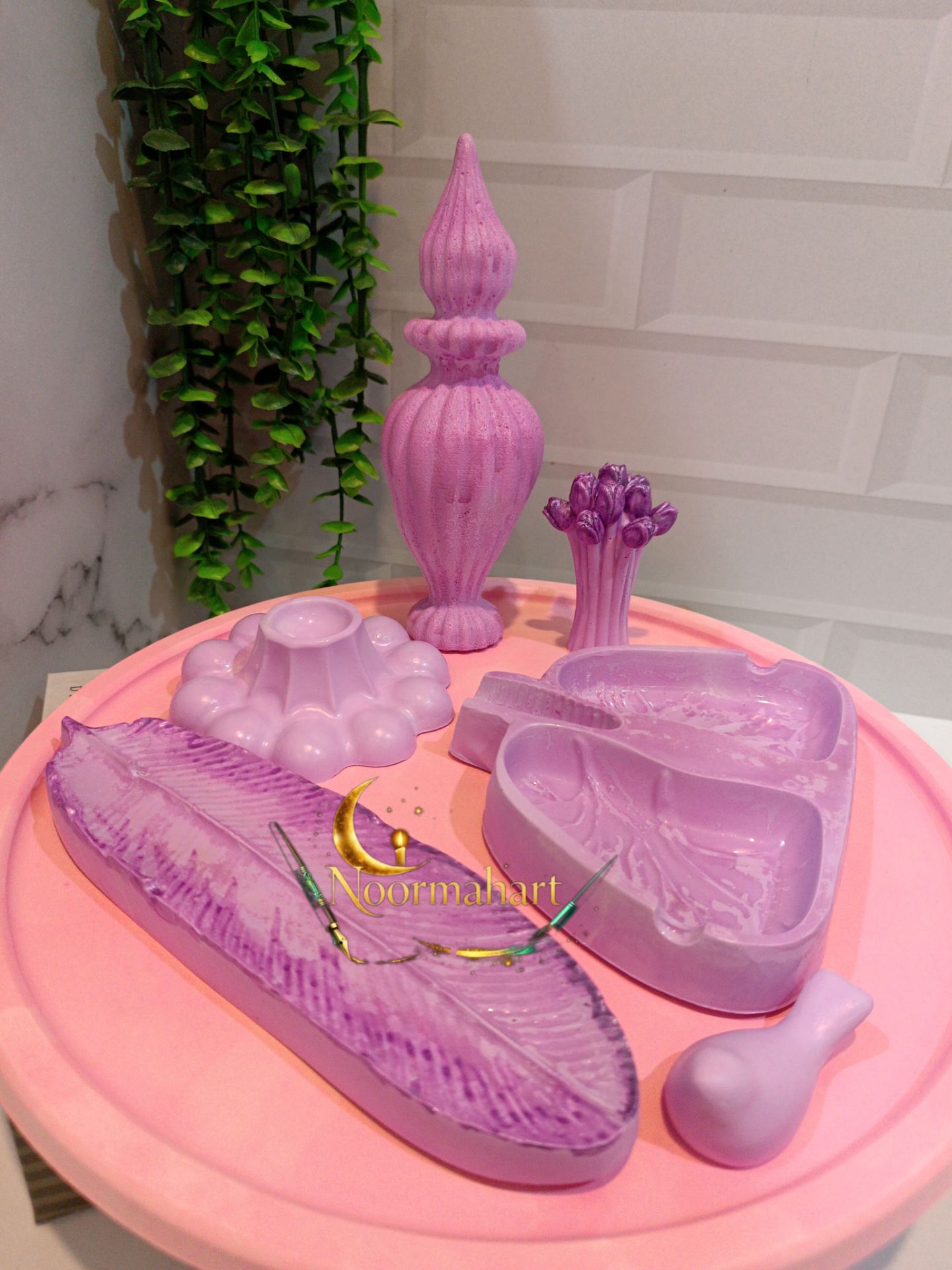سینی دکوری،دکوری مراکشی،دکوری دسته گل،زیرسیگاری طرح ریه،جاعودی طرح پر،جاشمعی و پرنده میباشد