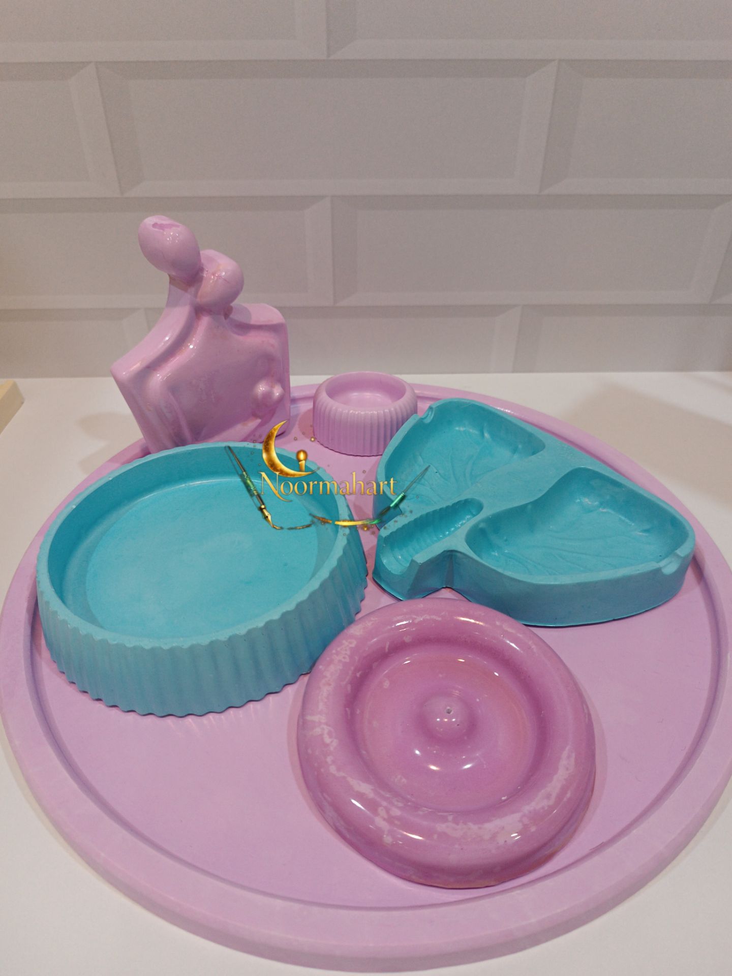 سینی دکوری،دکوری همدم،جاشمعی طرح مراکشی،کاسه تنقلات خوری طرح مراکشی،زیرسیگاری طرح ریه و جاعودی دایره ای میباشد